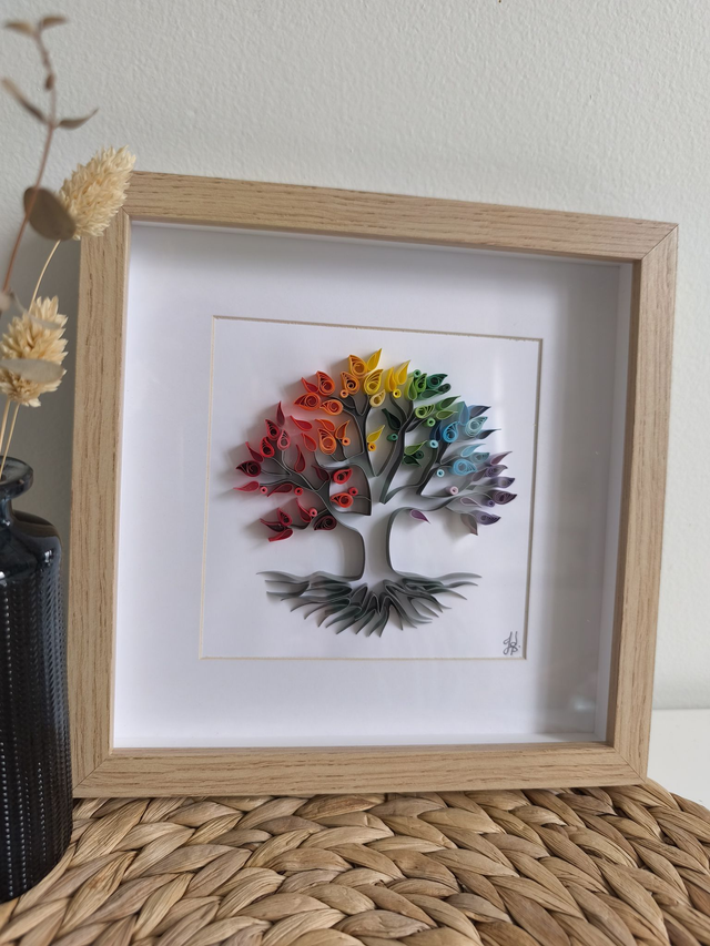 Cet arbre de vie multicolore trône dans un cadre de forme carré avec une finition en imitation chêne clair. Très symbolique, ce tableau s'intégrera facilement dans une décoration existante . Le tronc est gris avec un feuillage aux couleurs des saisons qui passent...