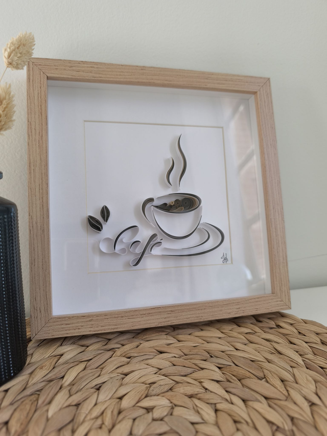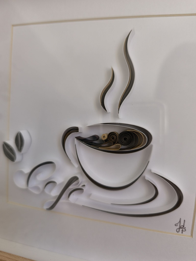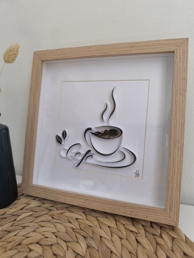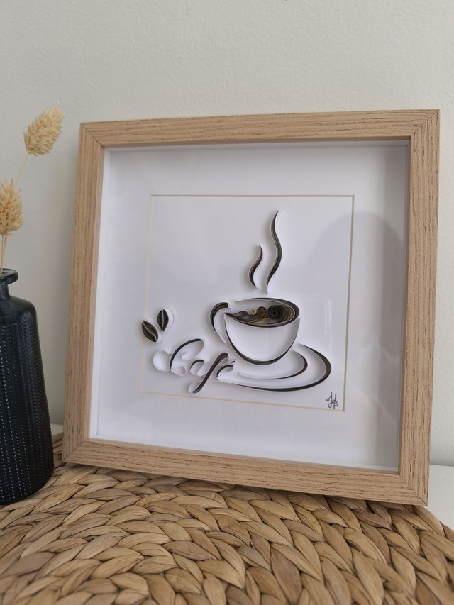 Ce tableau d'art en Quilling représente une tasse à café fumante dans un style très épuré. Les lignes réalisées par des bandes de papier roulées et collées offre un relief en 3D riche de ses ombres portées. Il trouvera sans nul doute sa place dans une décoration existante et pourquoi pas dans une cuisine!