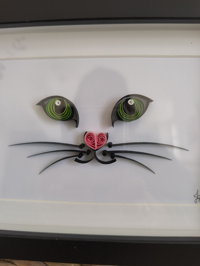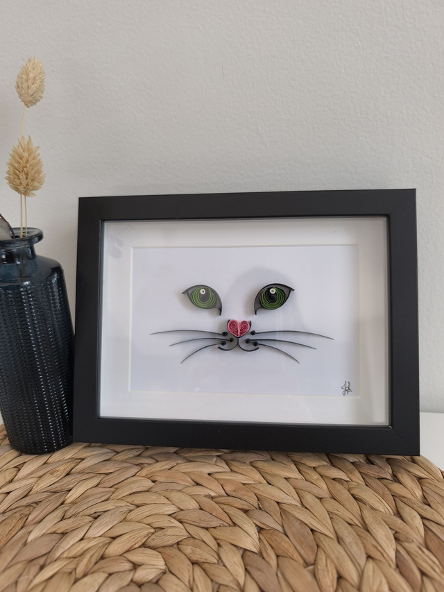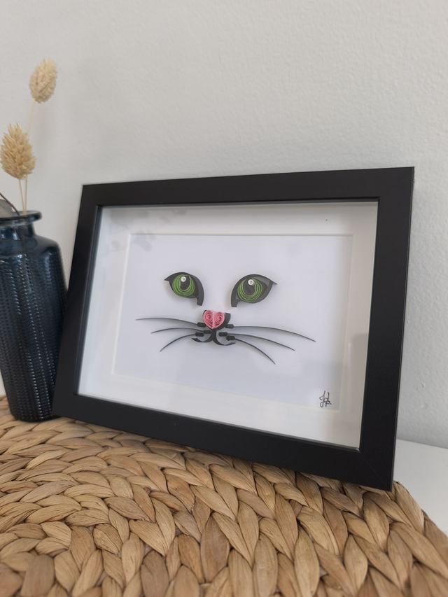 La technique du quilling permet par un jeu d'ombre et de vide de faire deviner un relief, ici une tête de chat très épurée. Nul doute que ce petit chat aux yeux verts trouveras sa place dans n'importe quelle décoration existante.