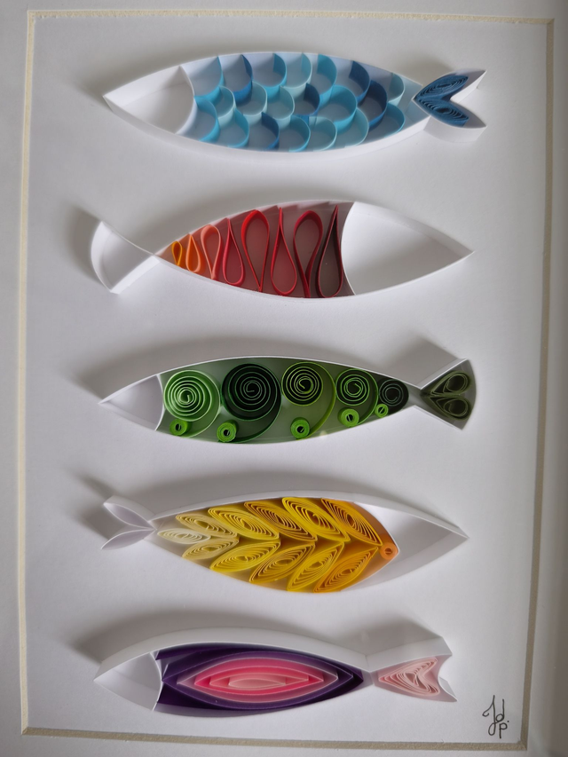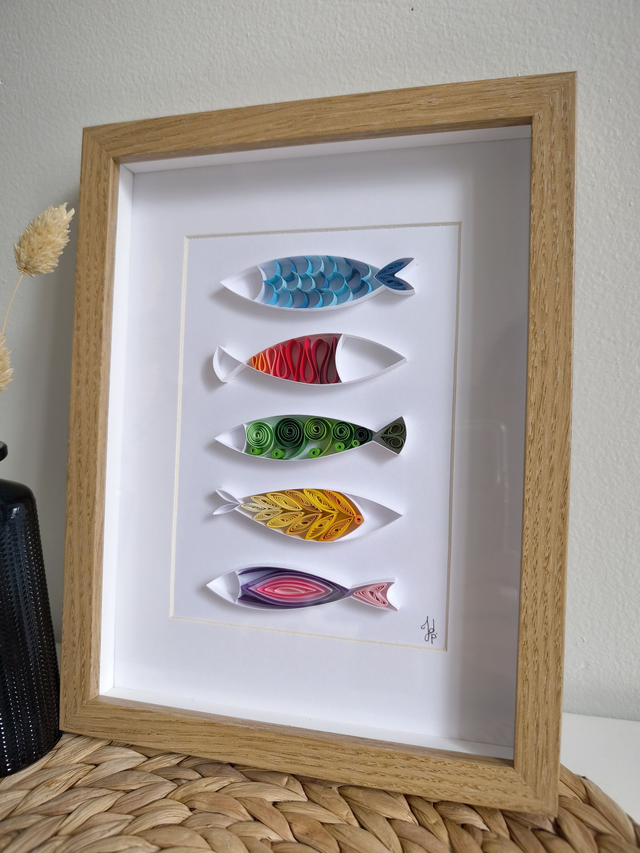 Ce tableau d'art en Quilling laisse apparaitre 5 poissons, tous unique par leur couleur et leur motif. Le relief et le jeu d'ombre apportés par cette technique en font un tableau très moderne et épuré qui s'adaptera à toute décoration existante.